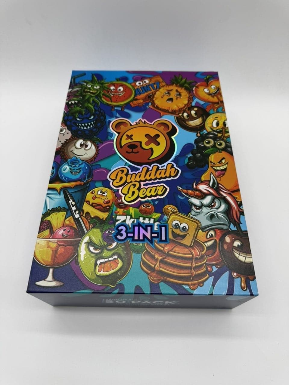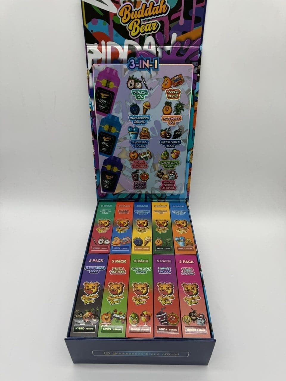 The Buddah Bear brand is best known for its disposable vapes and THC cartridges. Over time, the lineup expanded into wax, shatter, and multi-chamber devices like the Buddah Bear 3 in 1 bar.